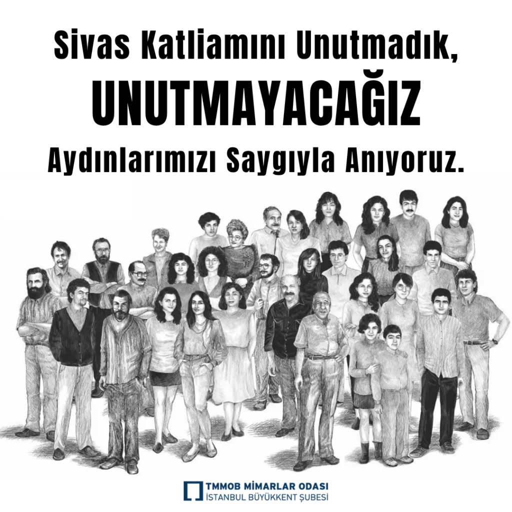 TMMOB Mimarlar Odası İstanbul Büyükkent Şubesi olarak, bundan 32 yıl önce, 2 Temmuz 1993’te Sivas’ta yaşanan insanlık dışı katliamda yaşamını yitiren aydınlarımızı, sanatçılarımızı, yazarlarımızı ve gençlerimizi özlem, öfke ve mücadele kararlılığıyla anıyoruz.