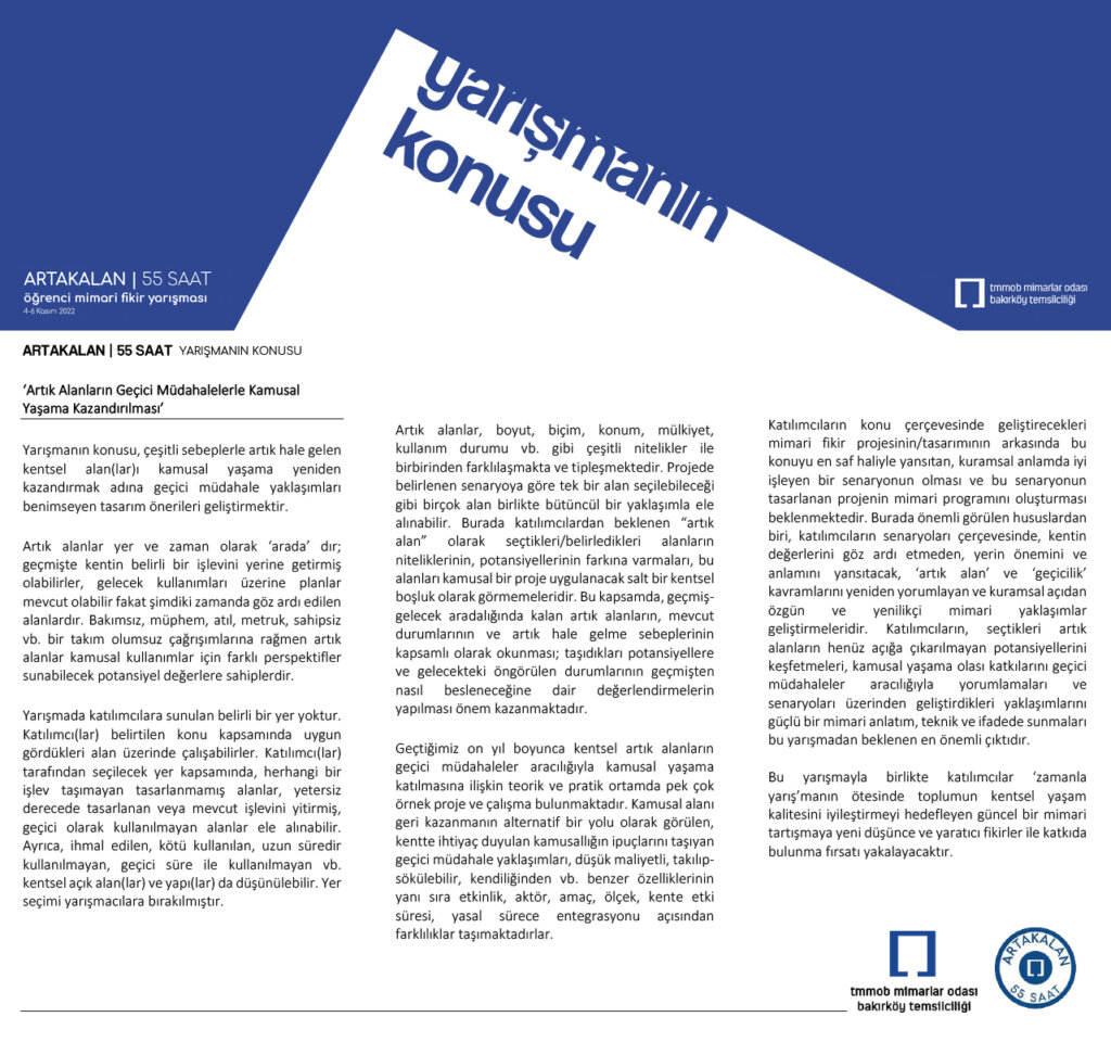 Deneysel ve özgür düşünme-üretme ortamı olarak yarışmaların enformel bir eğitim alanı olduğu gerçeği gözetilerek; belirli bir konuda, kısa sürede, yoğun motivasyon ile fikirlerin ve alternatiflerin oluşabilmesinin, olgunlaşabilmesinin ve ifade edilebilmesinin önemi vurgulanarak, ARTAKALAN | 55 SAAT Öğrenci Fikir Yarışması kurgulanmıştır.