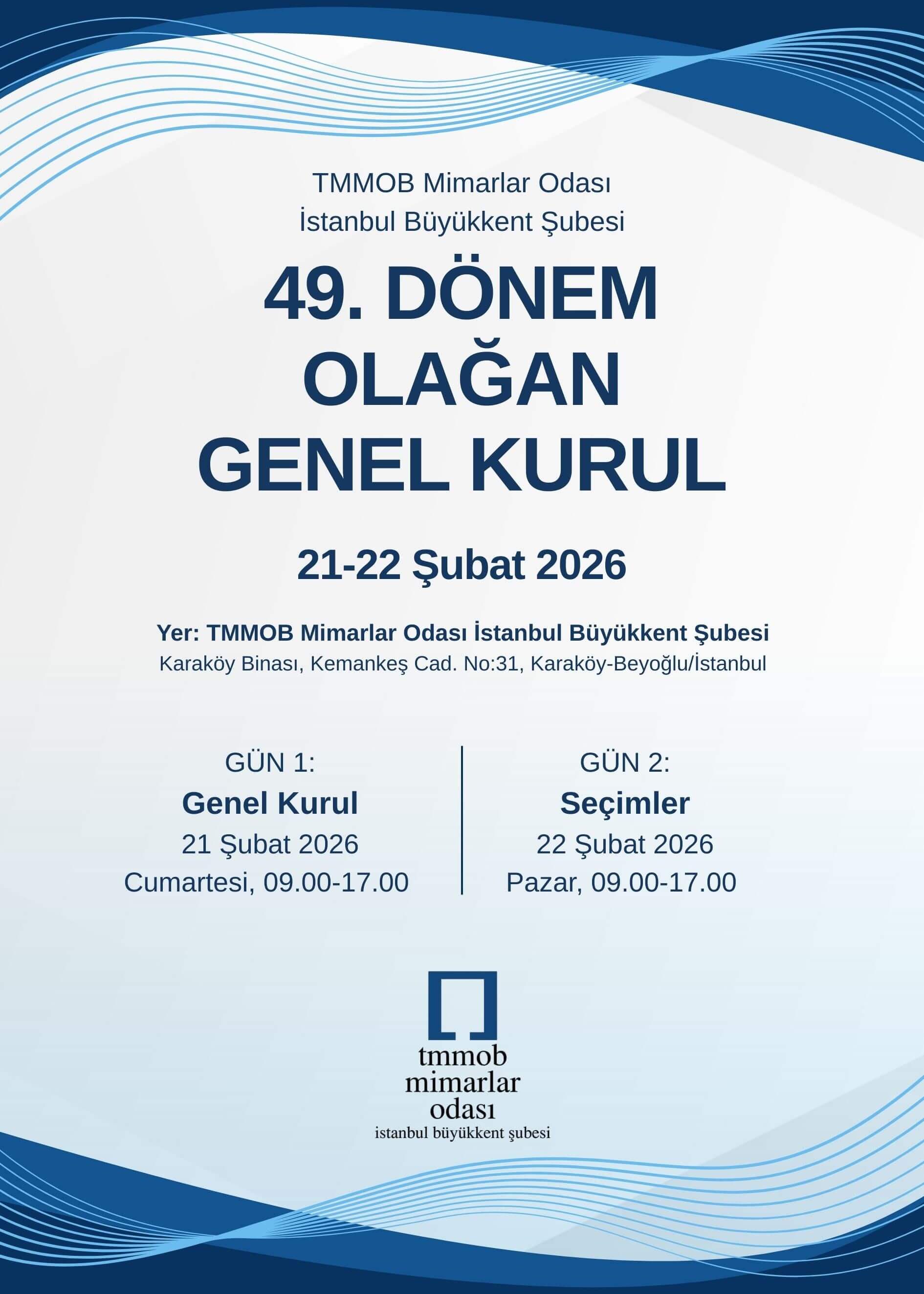 TMMOB Mimarlar Odası İstanbul Büyükkent Şubesi Yönetim Kurulu olarak, 49. Dönem Olağan Genel Kurulu’na ve seçimlerimize tüm meslektaşlarımızı katılmaya, katkı koymaya davet ediyoruz. Genel Kurul Gündemi: 1-Açılış 2-Başkanlık Divanı Seçimi ve Saygı Duruşu 3-