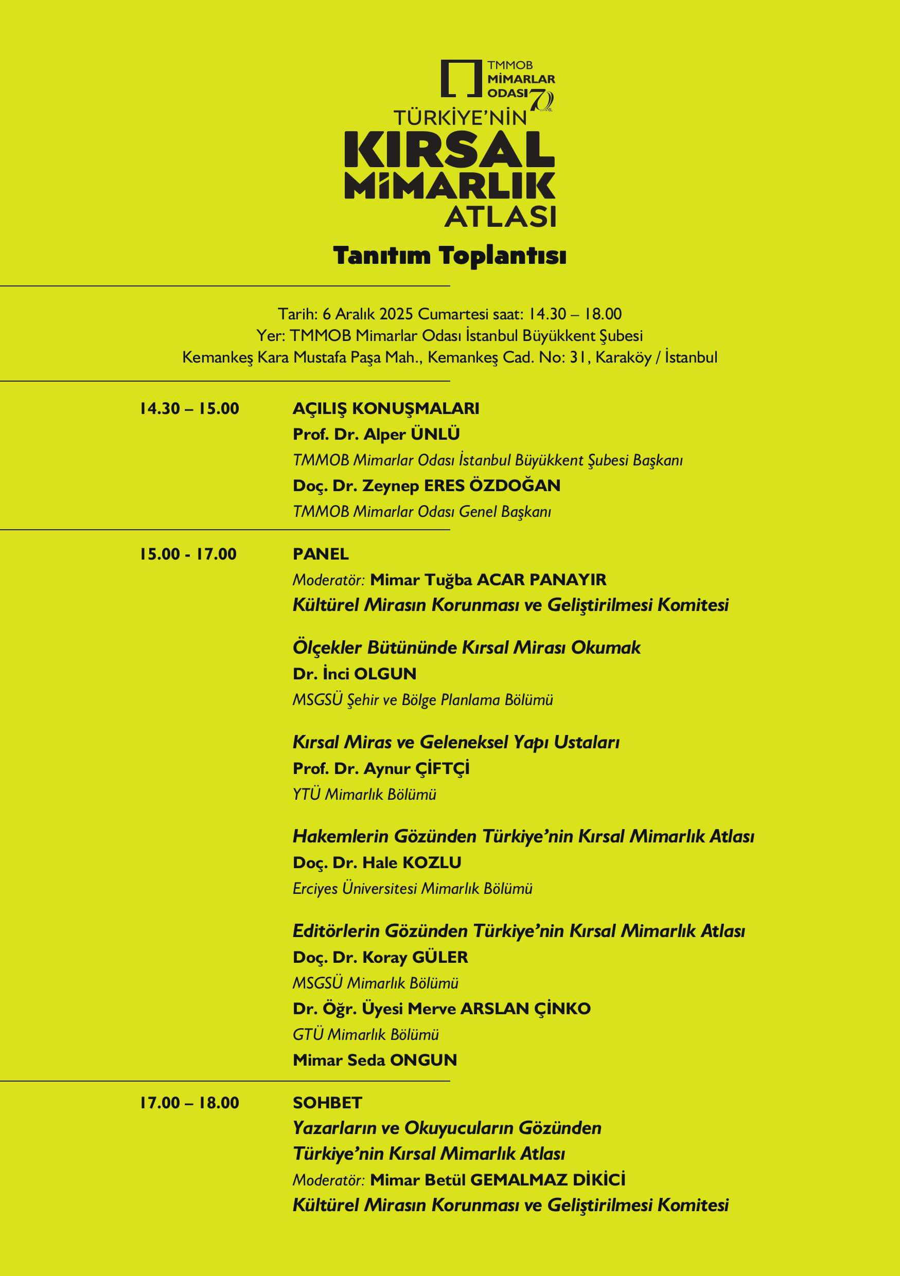 Türkiye’nin Kırsal Mimarlık Atlası’nın tanıtımı için 6 Aralık 2025 Cumartesi günü Mimarlar Odası İstanbul Büyükkent Şubesi’nde gerçekleştirecek buluşmaya tüm ilgilileri davet etmekten memnuniyet duyuyoruz.