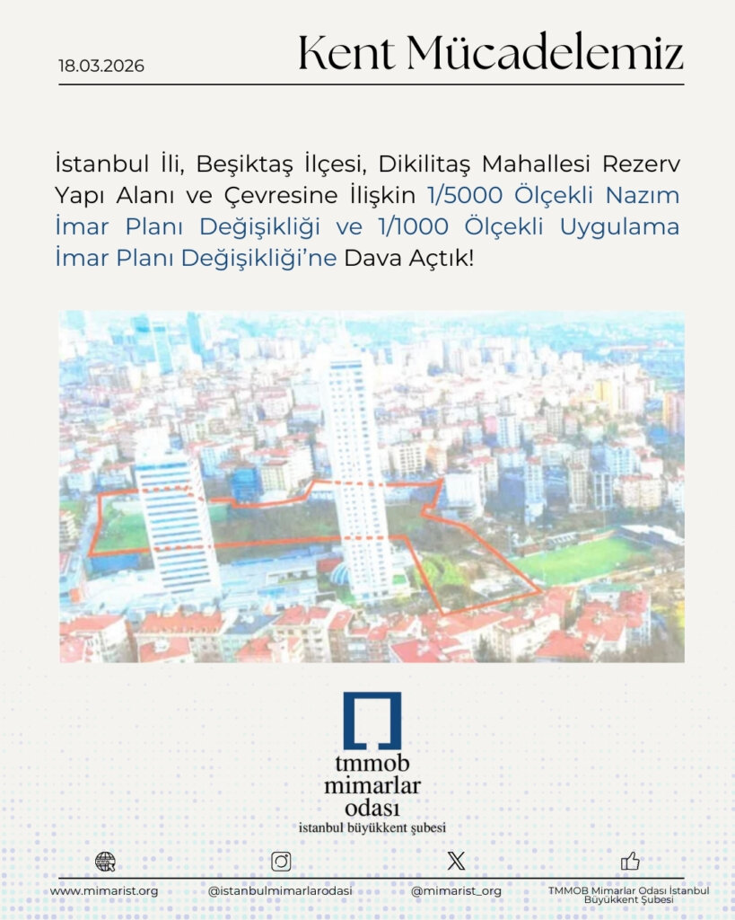 İstanbul İli, Beşiktaş İlçesi, Dikilitaş Mahallesi Rezerv Yapı Alanı ve Çevresine İlişkin 1/5000 Ölçekli Nazım İmar Planı Değişikliği ve 1/1000 Ölçekli Uygulama İmar Planı Değişikliği’ne Dava Açtık!