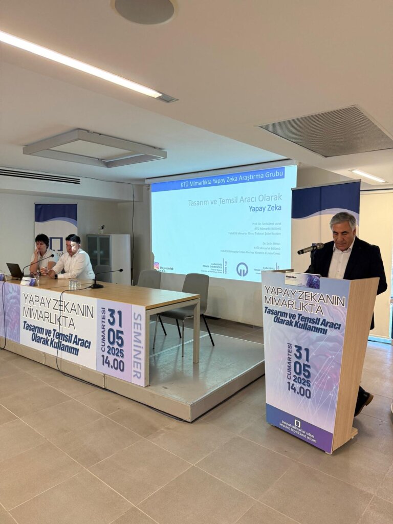 Seminerin konuşmacıları arasında yer alan Prof. Dr. Serbülent Vural (TMMOB Mimarlar Odası Trabzon Şubesi Başkanı), teknolojik gelişmelerin mimarlık tarihinde nasıl dönüştürücü kırılmalara yol açtığını tarihsel örnekler ve kavramsal yaklaşımlarla aktardı. Dijitalleşmenin sadece üretim araçlarını değil, mekânı kavrayış biçimlerimizi ve temsil pratiklerimizi de yeniden biçimlendirdiğini vurgulayan Vural, yapay zekânın bu bağlamda nasıl konumlandırılabileceğine dair eleştirel bir çerçeve sundu.