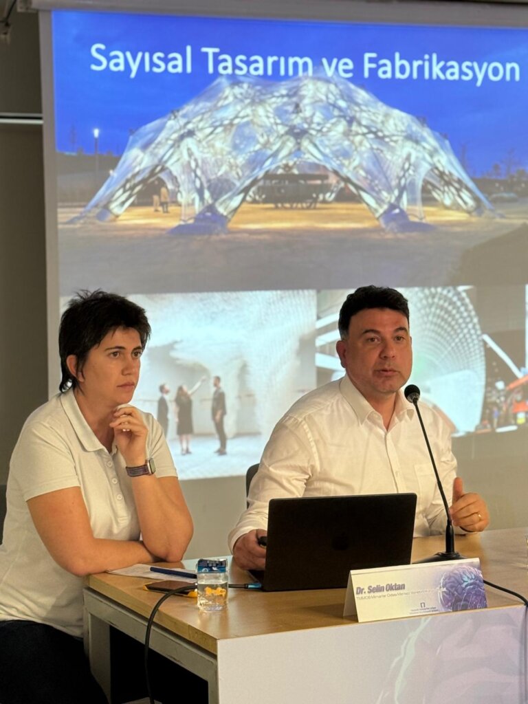 Dr. Selin Oktan (TMMOB Mimarlar Odası Merkez Yönetim Kurulu Üyesi) ise, özellikle üretken yapay zekâ sistemleri (generative AI) üzerine odaklandı. Oktan sunumunda, günümüzde mimari tasarım sürecinde kullanılan veri odaklı, öğrenebilen ve üretken algoritmaların örnek uygulamalar üzerinden nasıl işlediğini paylaştı. Mimarlık öğrencileri ve genç tasarımcılar arasında giderek yaygınlaşan bu araçların, tasarım kararlarını hangi ölçüde etkilediği ve kullanıcı ile makine arasındaki ilişkinin nasıl şekillendiği sorularını gündeme getirdi.