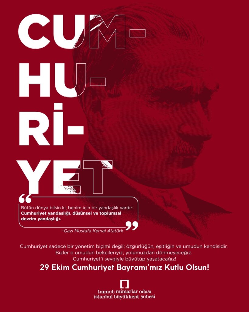Bizler, TMMOB Mimarlar Odası İstanbul Büyükkent Şubesi olarak, bu emri yürekten benimsiyoruz: Yeniden demokratik bir Cumhuriyet için, kurucularımızın devrimci ruhuyla birleşerek mücadele etmeliyiz. Sınıf dayanışmasını, emek haklarını ve ekolojik adaleti merkeze alan bir direnişle, otoriter eğilimleri püskürtmeli, çoğulcu bir demokrasiyi inşa etmeliyiz.