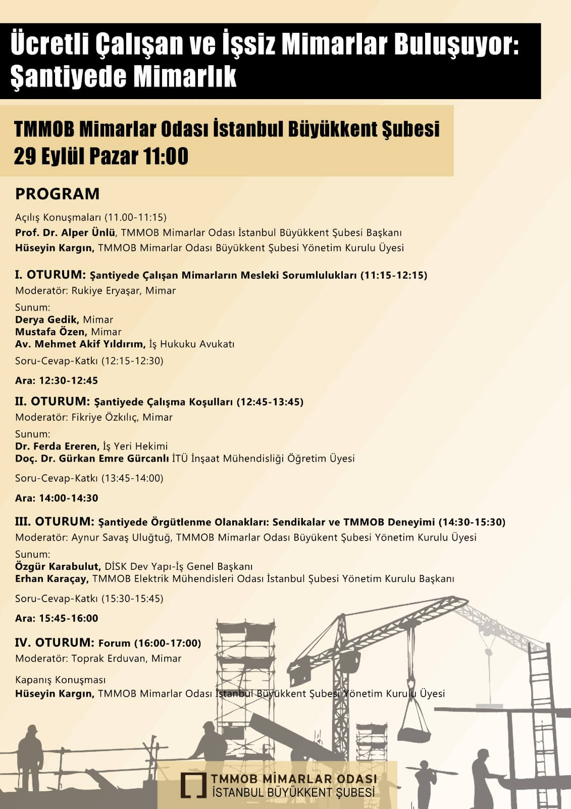 Şantiyede çalışan tüm mimarları, Ücretli Çalışan ve İşsiz Mimarlar Komisyonuna dahil olmaya, 29 Eylül Pazar günü gerçekleştirdiği etkinliğe katılmaya davet ediyoruz.