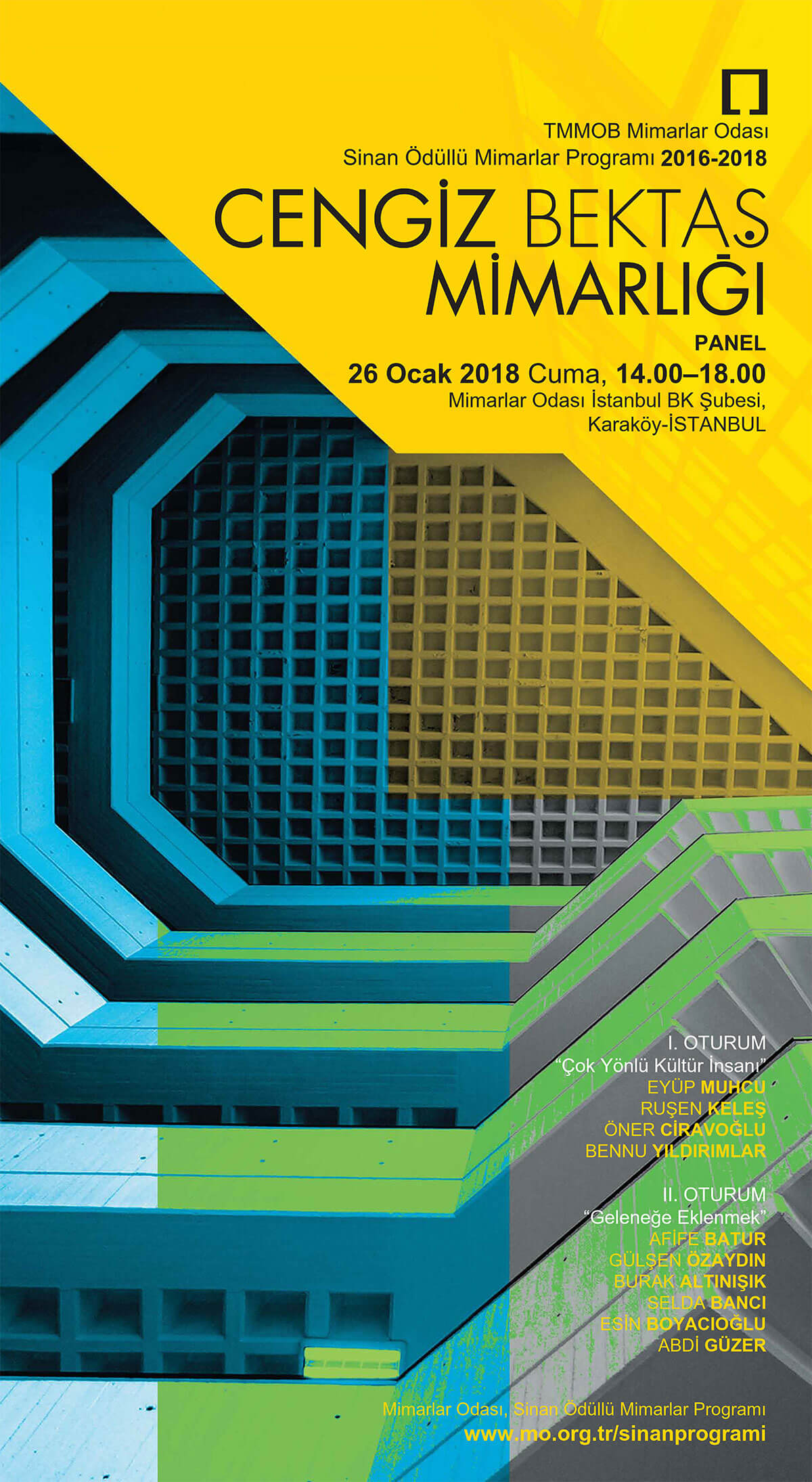 Mimar Sinan Büyük Ödülü’ne değer görülen mimarlar için düzenlenen ve 2016-18 döneminde dördüncüsü geçekleştirilen “Sinan Ödüllü Mimarlar Programı” kapsamında, 26 Ocak 2018 Cuma günü Mimarlar Odası İstanbul Büyükkent Şubesi’nin Karaköy Binasında bir panel düzenleniyor.