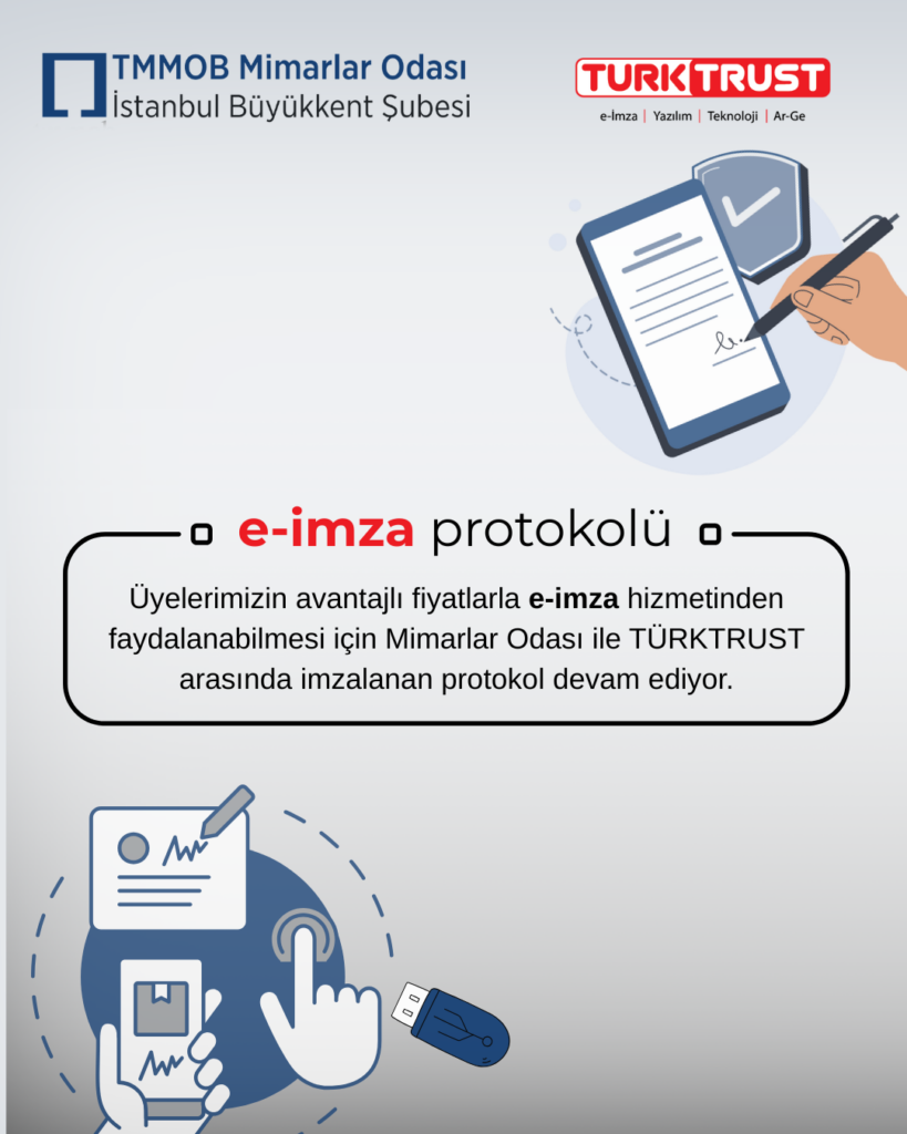 Üyelerimizin avantajlı fiyatlardan e-imza hizmetinden faydalanabilmesi için TÜRKTRUST firmasıyla imzalanan protokol devam ediyor. Bu protokol kapsamında her yıl enflasyon oranında fiyatların güncelleneceği belirtilmiş olup 2025 yılında ise güncellenen fiyat üzerinden 1 yıl için 1459 TL, 2 yıl için 1799 TL, 3 yıl için 2099 TL ücret ödeyerek üyelerimizin e-imza paketine (Nitelikli Elektronik Sertifika+Akıllı Kart+Kart Okuyucu) sahip olabileceğini bilgilerinize sunarız.