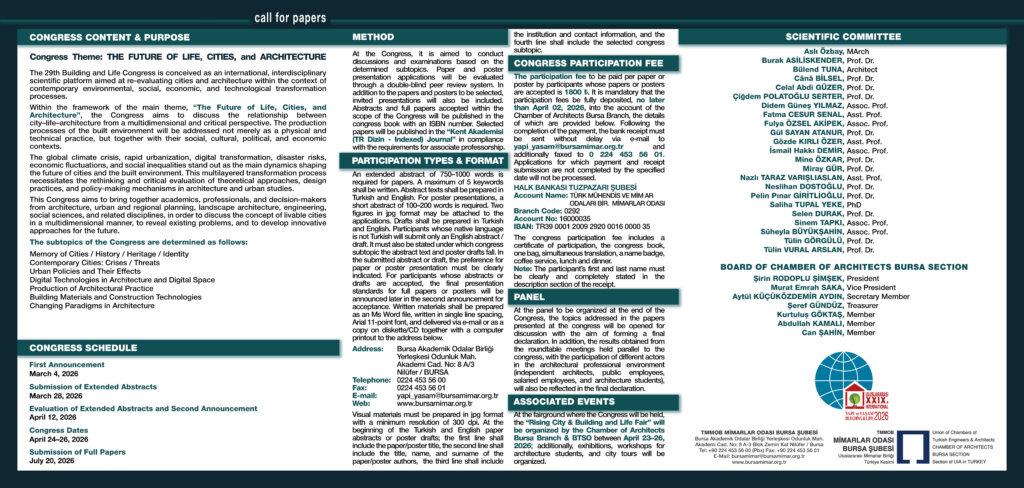 29. Yapı ve Yaşam Kongresi, kentlerin ve mimarlığın günümüz çevresel, sosyal, ekonomik ve teknolojik dönüşüm süreçleri bağlamında yeniden değerlendirilmesini amaçlayan uluslararası, disiplinlerarası bir bilimsel platform olarak kurgulanmaktadır.